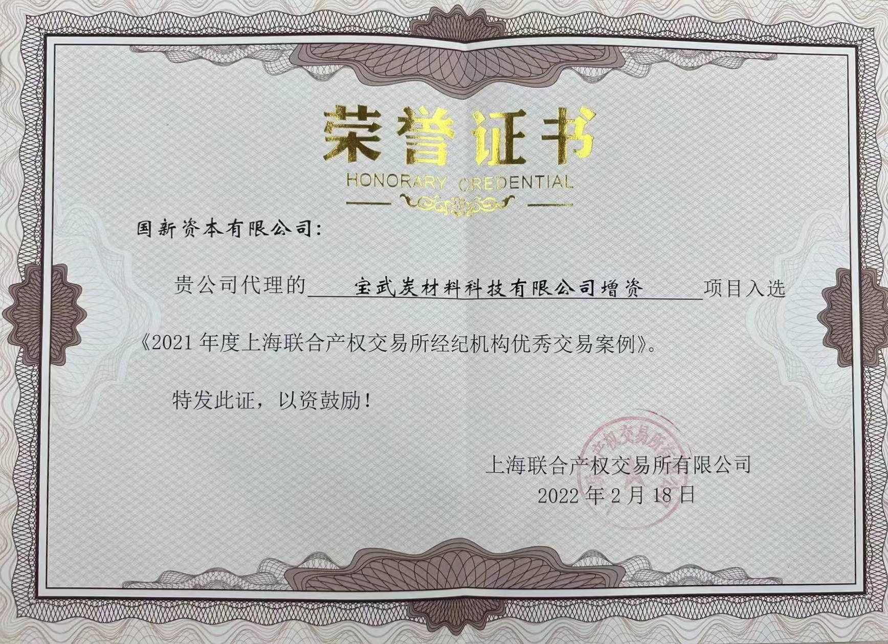 近日,国新资本代理的“宝武炭材料科技有限公司增资”产权经纪服务项目,入选《2021年度上海联合产权交易所经纪机构优秀交易案例》。